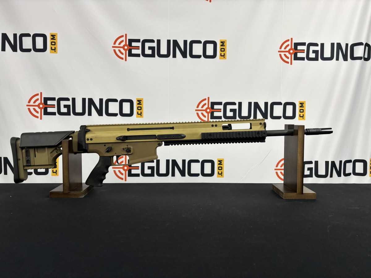 FN SCAR 20S 7.62 NATO/.308. IT FEATURES A GEISSELE TRIGGER, FDE FINISH, 20 INCH BARREL, HEAVY DUTY ALUMINUM ADJUSTABLE STOCK, 3 PRONG FLASH HIDER, FULL LENGTH TOP RAIL, 3 FORWARD MOUNTED PICATINNY SECTIONS, HOGUE GRIP. GUN HAS A FEW LIGHT SCUFFS.